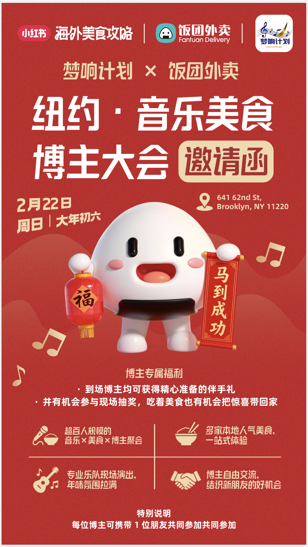 在万象更新、喜气洋洋的马年大年初六,【梦响计划】与【饭团外卖】携手,以无比的热情和诚意,隆重邀请您参与一场前所未有的视听味觉盛宴——音乐美食博主大会!这不仅是一场简单的新春聚会,更是首次在纽约布鲁克林举办的、规模空前的大型博主线下交流盛典,旨在汇聚纽约及周边地区最具影响力的音乐与美食内容创作者,共同庆祝农历新年,并搭建一个充满活力与创意的交流平台。
